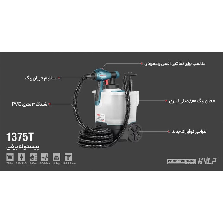 هر چند سال یکبار لازم است تا خانهی خود را نقاشی کنید. دلیل این موضوع کثیف شدن یا ترک خوردن دیوارها، سقف و مواردی از این دست است. شاید به نظر شما، رنگ کردن خانه کار چندان جذابی نباشد. این تصور به دلیل بوی نامطبوع رنگ و انرژی زیادی است که باید صرف نقاشی محیط خانه کنید. از طرفی هزینهی بالایی که برای نقاشی به پیمانکار یا نقاش بپردازید هم چندان قابل قبول نیست. این مورد باعث میشود که بخواهید خانهی خود را شخصا نقاشی کنید. پس برای این کار باید وسایل مورد نیاز را تهیه کنید. به کارگیری قلمو، غلطک و استفاده از وسایل دستی، هم انرژی زیادی را از شما میگیرد و هم ممکن است که نتوانید کارتان را در سطح قابل قبولی انجام دهید. یکی از راه حلهای موجود استفاده از پیستولههای برقی است که هم کارتان را راحتتر میکند و هم کیفیت کار را بالا میبرد. پیستولهی برقی مدل 1375T که شرکت رونیکس آن را تولید کرده، از جمله محصولاتی است که کمک بسیار زیادی به سرعت عمل شما در نقاشی و رنگآمیزی میکند, این پیستوله مجهز به موتور پر قدرت 750 وات تحت سیستم رنگ پاشی HVLP مطابق با استاندارد CE اروپا می باشد که قابلیت پاشش رنگ به صورت افقی، عمودی و چرخشی را دارد و مجهز به دو عدد نازل با قطر پاشش 1.8 و 2.6 میلیمتری شده است. مخزن متصل به این پیستوله گنجایش 800 سیسی رنگ را دارد. ویژگی اصلی این پیستوله مخزن قابل حمل و شلنگ 3 متری دارای قابلیت جمع شدن داخل مخزن می باشد.