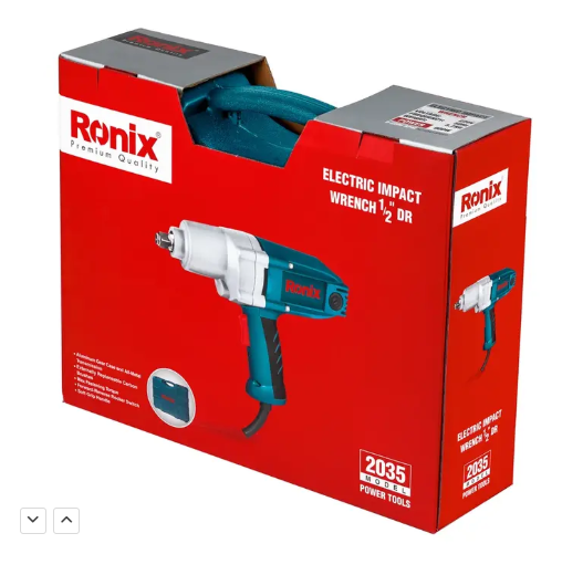 آچار بکس برقی فوق یکی از محصولات تولیدی شرکت «رونیکس» (Ronix) است. این آچار برخلاف بسیاری از آچار بکسها که با فشار باد کار میکنند انرژی خود را از نیروی برق تامین میکند. حداکثر سرعت گردش این دستگاه 2200 دور بر دقیقه بوده و قادر است در زمان یک دقیقه 3000 ضربه را وارد آورد. این آچار بکس گشتاوری 350 نیوتنمتری دارد و توان آن 900 وات است. با کمک این دستگاه میتوانید پیچهای استاندارد در سایز 14 تا 22 میلیمتر و پیچهای سفت 10 تا 16 میلیمتری را باز و بسته کنید. شرکت رونیکس بههمراه این دستگاه دو سری بکس 20 و 22 میلیمتری عرضه میکند. این محصول توانسته است استاندارد CE اروپا را اخذ کند. سیستم کلاچ و گیربکس این دستگاه طراحی مناسبی داشته و از استحکام و قدرت مناسبی برخوردار است. آچار بکس برقی فوق درایوی ½ اینچی دارد و با نام «2035» به بازار عرضه میشود. برای حمل این دستگاه کیفی پلاستیکی طراحی شده است.