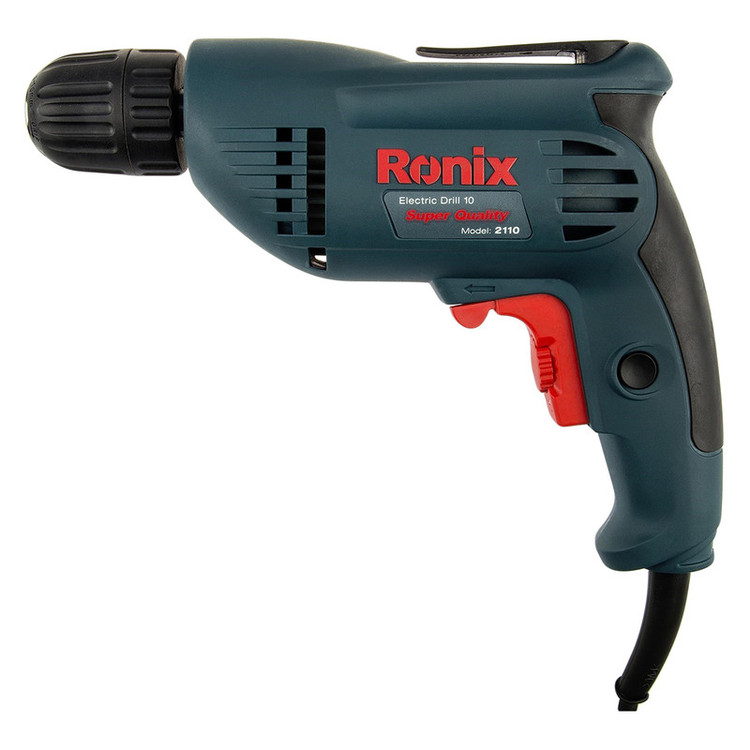 دریل برقی مدل 2110 یک دستگاه ساده، کوچک و مناسب برای استفاده در منزل یا محل کار است. این محصول با برند «رونیکس» (Ronix) تولید و به بازار عرضه میشود. 2110 به یک موتور تک سرعتی مجهز شده و قابلیت گردش به طرفین را دارد. برای این محصول یک سهنظام خودکار در نظر گرفتهاند و برای تعویض مته نیاز به استفاده از هیچ نوع ابزاری ندارید. این مدل را شرکت ایرانی رونیکس تولید میکند. این شرکت مدتی است که به ساخت و عرضهی ابزارهای مختلف اشتغال دارد. موتور در نظر گرفتهشده برای مدل 2110، با قدرت 400 وات عمل میکند. سرعت گردش این دریل تا 2900 دوربردقیقه میرسد. این سرعت گردش با استفاده از پیچ قرارگرفته روی شستی تنظیم میشود. علاوه بر این جهت گردش دریل هم بهصورت راستگرد و هم بهصورت چپگرد، امکانپذیر است. از این دستگاه برای سوراخکاری اجسام و قطعات مختلف چوبی یا فلزی استفاده میکنند. حداکثر قطر سوراخکاری این دستگاه در چوب و فلز به ترتیب 25 و 10 میلیمتر است. ویژگی این دستگاه استفاده از سهنظام خودکار در تولید این محصول است؛ بهعبارتدیگر برای تعویض مته، نیازی به استفاده از آچار ندارید. همچنین یک گیره پلاستیکی روی دستگاه قرارگرفته که از آن برای اتصال دستگاه به کمربند استفاده میکنند. این دستگاه 1.5 کیلوگرم وزن دارد. با توجه به افزایش اشتیاق افراد جامعه به انجام خودکفای کارهای فنی منزل و محل کار، تهیهی ابزارهای موردنیاز برای این موضوع هم به تنوع بسیار زیادی انجام میشود. ازجملهی ابزارهایی که امروزه در منازل و مغازههای مختلف میبینیم، دریل برقی یا شارژی است. این دستگاه برای سوراخکاری اجسام مختلف به کار میرود. دریل برقی مدل 2110 رونیکس یک دریل برقی ساده با قدرت 400 وات است که سرعت آن حداکثر تا 2900 دوربردقیقه تنظیم میشود.