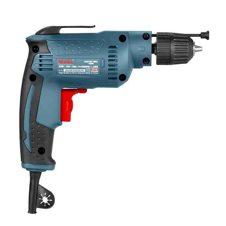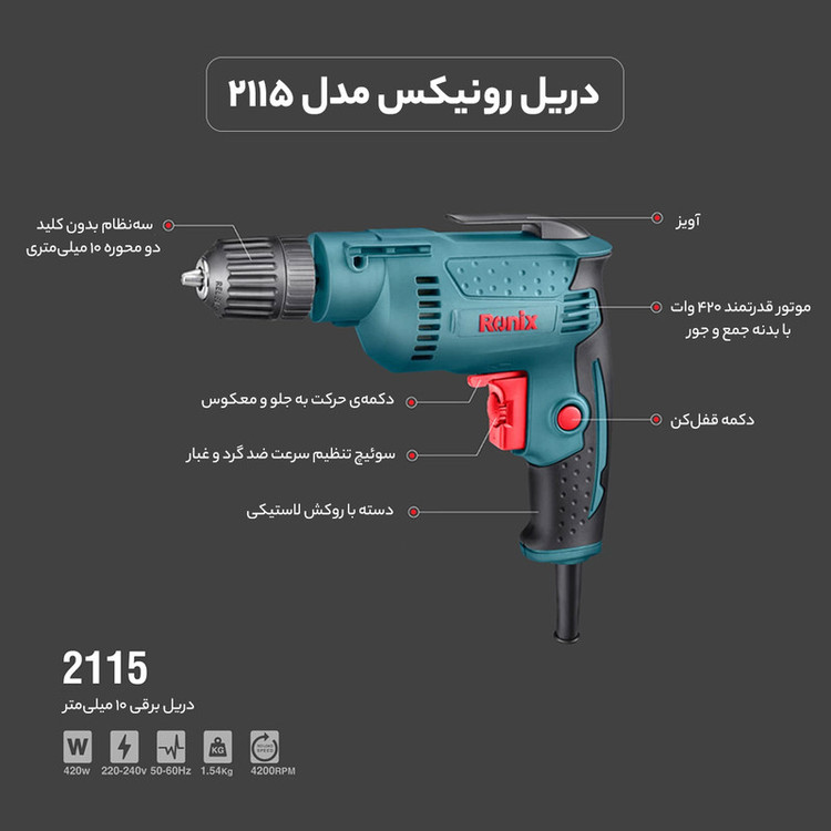 دریل برقی 2115 رونیکس، با موتور پرقدرت 420 وات کار میکند و مجهز به آرمیچر و بالشتکهای صنعتی با کیفیت ساخت فوقالعاده بالا است. در نتیجه، مداومت کاری دستگاه بیشتر شده و قدرت سوراخکاری آن دوچندان میشود. دریل برقی 2115 رونیکس، مجهز به سه نظام مستحکم، 10 میلیمتری و اتوماتیک است؛ برای تعویض مته نیازی به آچار ندارد و همین موضوع تاثیر شگرفی بر سرعت کار با آن میگذارد. این ابزار برقی کاربردی، با برخورداری از اهرم چپگرد/راستگرد میتواند در کنار عملیات دریلکاری به عنوان پیچگوشتی برقی نیز کار کند. کلید اصلی این دریل، ضد غبار و دیمردار بوده و سرعت چرخش مته را تنظیم و کنترل میکند. افزونبراین، قفلکن کلید، دریل را بعد از روشنشدن در حالت روشن نگه میدارد تا بتوانید آن را در مدتزمانی طولانی و بدون نیاز به فشردن دائمی کلید اصلی، روشن نگه دارید