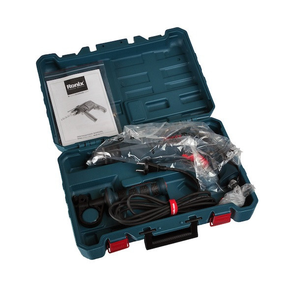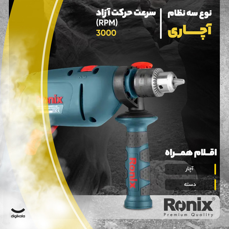 ویژگی های این محصول-مجهز به موتور پرقدرت صنعتی با توان 810 وات برای بیشترین بهره وری در حالت عادی و چکشی-استفاده از سیستم بلبرینگی دوبل در قسمت شفت جهت اثر بخشی بالا حین سوراخکاری ضربهای و طول عمر کارکرد-دارای سه نظام آچاری تمام فلزی و مستحکم-مجهز به دسته گردان ارگونومیک 360 درجه-دارای قابلیت چرخش مته به صورت چپگرد و راستگرد- دارای کلید الکترونیک دیمردار ضد غبار جهت تنظیم دقیق سرعت مته برای کار روی سطوح مختلف-مجهز به مخزن نگهدارنده مته تعبیه شده در دسته جانبی و میله تنظیم عمق