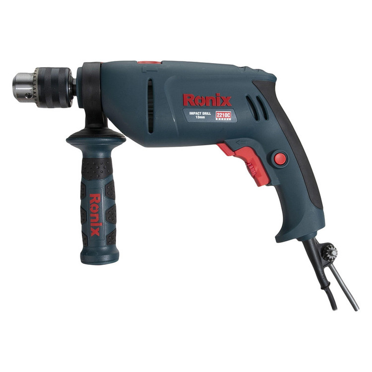 انواع دریلها را از نظر ساختار میتوان به دریلهای ستونی و قابل حمل تقسیم کرد. دریلهای تخریب هم در هر دو گونهی برقی و شارژی قابل تهیه هستند؛ پیستون واقعی درنظر گرفته شده برای این دریلها در مقایسه با دریلهای چکشی معمولی قدرت ضربه و تخریب بیشتری دارند. بارزترین تفاوت میان دریلهای تخریب و دریلهای چکشی هم توانایی ضربه زدن با نوک ابزار نوع پیستونی، آنهم بدون چرخش ابزار است؛ در حالی که در نوع معمولی یا چکشی چنین امکانی فراهم نیست. انواع دریلهای شارژی امروزی معمولا از باتریهای نیکل-کادمیوم یا لیتیومی استفاده میکنند. حتی انواع چکشی این دریلهای شارژی هم در ابعاد بسیار کوچک وجود دارند. دریل C2210 از شرکت رونیکس نیروی خود را از طریق برق شهری تامین میکند. بیشینه سرعت دوران این دریل 3000 دور بر دقیقه است. این دریل توانایی چرخش در دو جهت را دارد. با استفاده از این دریل قادر خواهید بود سوراخهایی حداکثر با قطر 13 میلیمتر در فلز و 13 میلیمتر در سیمان یا مصالح مشابه، ایجاد کنید. این دریل با داشتن قابلیت چکشی و توان 810 دریلی مناسب برای مصارف خانگی و تجاری است.
