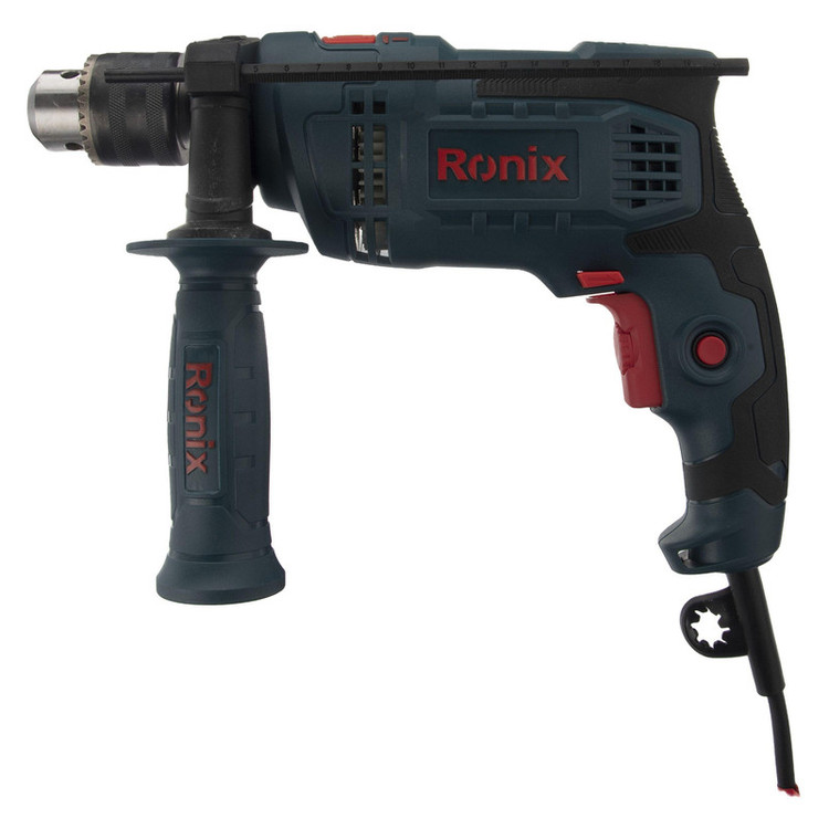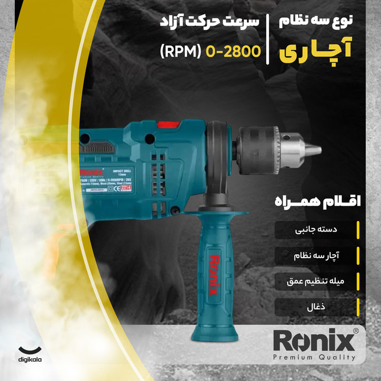 دارای بدنه ارگونومیک با وزن مناسب جهت استفاده های طولانی مدت- دارای سه نظام آچاری 13 میلیمتری تمام فلزی، بسیار مستحکم و قوی- دارای حداکثر تعداد ضربه در حالت چکشی، برای استفاده بر سخت ترین سطوح- مجهز به دسته جانبی 360 درجه با خاصیت ضد لرزش برای افزایش دقت در کار در تمامی جهت ها- دارای دکمه گازی جهت کنترل سرعت دریل از حداقل تا حداکثر- دارای دکمه الکترونیک ضد غبار چپگرد/راستگرد- دارای کلید الکترونیک دیمردار ضد غبار با قابلیت تنظیم دقیق سرعت برای کار بر روی سطوح مختلف