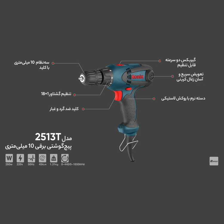 ویژگی های این محصول- مجهز به موتور پر قدرت 280 واتی- مجهز به گیربکس دو سرعته صنعتی قابل تنظیم در گشتاورهای متفاوت جهت پیچ کاری- طراحی منحصربفرد بدنه، مقاوم در برابر انواع ضربات حین کار و سقوط دستگاه از ارتفاع-دارای کلید گازی ضدغبار جهت عملکرد آسان و تنظیم سرعت-دارای طراحی ارگونومیک جهت کنترل آسان و کاهش خستگی ناشی از کار- دارای گیره اتصال کمری از جنس فلز برای حمل آسان و استفاده در ارتفاع
