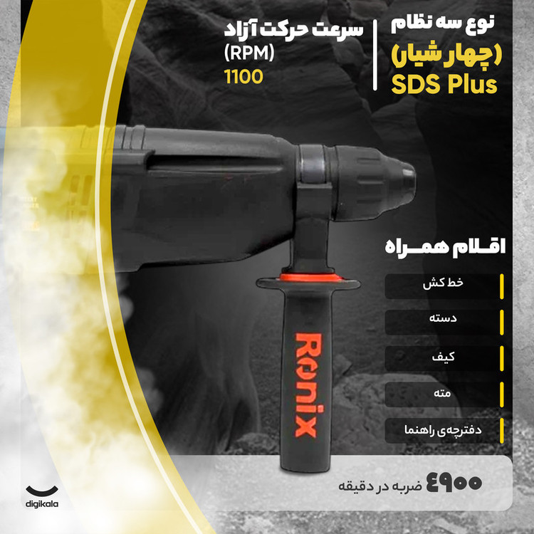 عمق سنج، ذغال یدکی، متههای مختلف با اندازههای 7×150 ، 8×150 ، 10×150 ، 12×150 ، دسته جانبی ارگونومیک رونیکس