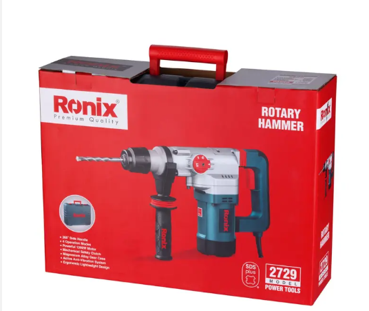 ظرف گریس، میله تنظیم عمق، دسته جانبی طراحی شده توسط رونیکس و کیف حامل متهها شامل: یک مته SDS-PLUS 8x150 یک مته SDS-PLUS 10x150 یک مته SDS-PLUS 12x150 یک مته نوک تیز SDS-PLUS 14x250 یک مته نوک تخت SDS-PLUS 14x250