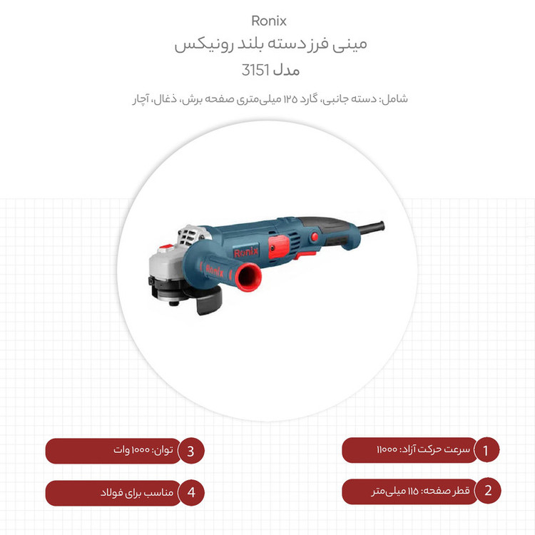 مینی فرز برقی دسته بلند 3151 از موتوری قدرتمند با توان 1000 وات برخوردار است که این موتور متشکل از آرمیچر و بالشتک های تولید شده توسط دستگاه های تمام اتوماتیک است. صفحه فرز این دستگاه با سرعت 11000 دور در دقیقه می چرخد و برای استفاده از این مینی فرز می بایست از صفحاتی تا قطر 115 میلی متر استفاده کرد.مینی فرز 3151 از طراحی متفاوتی نسبت به سایر مینی فرزها برخوردار است و با داشتن دسته بلند و کشیده موجب عملکرد بهتر دستگاه می شود. بدنه ارگونومیک و وزن سبک آن کاربری آسانی را به وجود آورده است تا افراد بتوانند با کمترین میزان خستگی برای ساعت ها با آن کار کنند. همچنین دسته جانبی تعبیه شده بر بدنه این مینی فرز 115 میلی متری مجهز به روکش ضد تعریق بوده که از لرزش و تعریق دستگاه در دست افراد جلوگیری می کند.سیستم گردش هوای داخلی پیشرفته از ویژگی های مهم در 3151 است که هوای گرم به وجود آمده را از طریق شیارهای روی بدنه به بیرون می فرستد و باعث خنک شدن موتور میشود. در واقع این سیستم موجب افزایش زمان کار مستمر دستگاه شده و از قطعات داخلی آن در برابر حرارت حفاظت می کند.