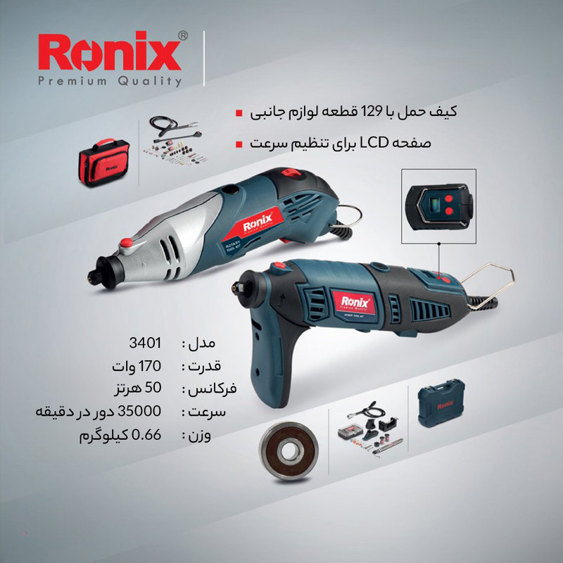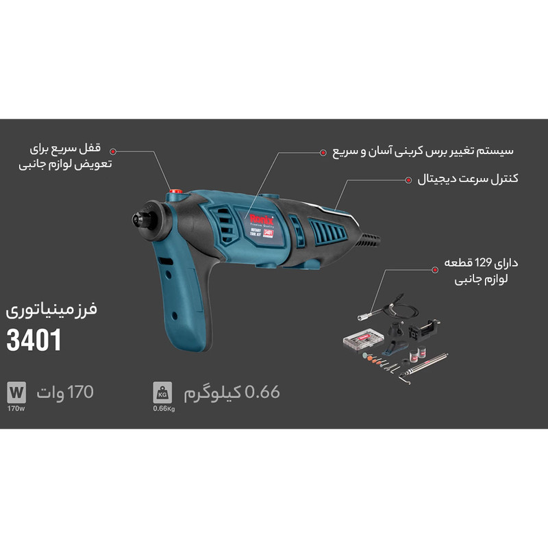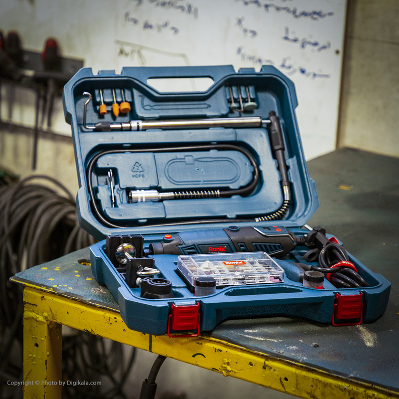 دارای قابلیت تنظیم سرعت از 8000 تا 35000 دور در دقیقه برای سازگاری با نیازهای مختلف کاربر- بسته بندی شده در یک کیف BMC مقاوم شامل یک شلنگ انعطاف پذیر، یک پایه آویز و 126 عدد متعلقات کاربردی مختلف برای سنباده زنی، برش، صیقل دادن، کنده کاری، پرداخت و تمیز کردن سطوح مختلف چوبی و فلزی- مجهز به سیستم قفل شفت برای تعویض سریع و آسان متعلقات با ایمنی و دقت بیشتر- دارای کولت یا ابزارگیری با ظرفیت 3.2 میلیمتر جهت ثابت نگه داشتن انواع متعلقات در سه سایز 2، 2.5 و 3.2 میلیمتر