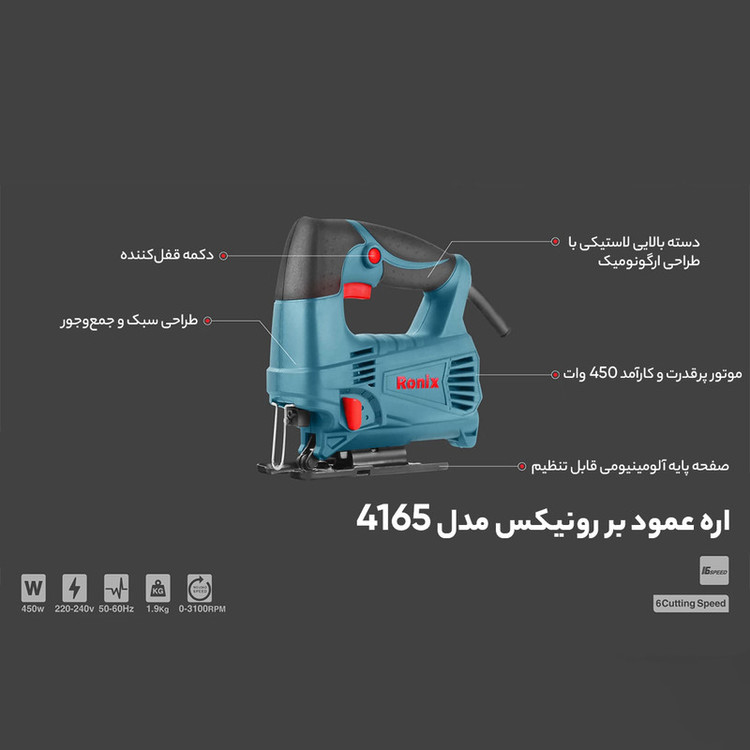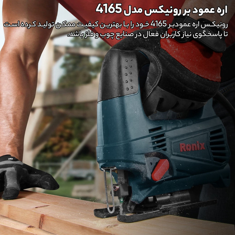 ارهی عمودبر مدل 4165 دستگاهی است که برش را با حرکت عمودی تیغه انجام میدهد. این اره را شرکت «رونیکس» (Ronix) میسازد. در ساخت این دستگاه از موتوری با قدرت مناسب استفادهشده و کیفیت قابلقبولی در ساخت این دستگاه بهکاررفته است. این محصول قابلیت برش زاویه را هم دارد. همچنین برای جلوگیری از پخش شدن گردوغبار قابلیتی روی بدنهی دستگاه در نظر گرفتهشده است. اره عمود بر دارای تیغهی مخصوصی است که در دو نوع چوببر یا فلزبر تولید میشود. با اتصال تیغهی موردنظر و روشن کردن دستگاه، تیغه بهصورت عمودی حرکتی رفتوبرگشتی دارد. مدل 4165، وزنی در حدود 2 کیلوگرم و موتوری با قدرت 240 وات دارد. در ساخت موتور دستگاه، شاخصهای استاندارد CE اروپا را در نظر میگیرند. سرعت حرکت رفت و برگشتی تیغه تا 3100 بار در دقیقه میرسد. با این دستگاه میتوانید قطعات چوبی و فلزی را به ترتیب تا قطر 65 و 6 میلیمتر برش دهید. برای این مدل، قابلیت برش تا زاویهی 45 درجه در نظر گرفتهشده است. همچنین سرعت موتور وابسته به میزان فشار کاربر به شستی دستگاه بستگی دارد. اگر میخواهید از پخش شدن گردوغبار، خاکاره یا پلیسههای فلزی جلوگیری کنید، امکان اتصال این مدل به جاروی برقی یا مکندههای هوا وجود دارد. استفاده و کاربرد این دستگاه بیشتر در کارگاههای نجاری و یا در ساخت دکوراسیون چوبی است. اگر مدل 4165 را که با توان 240 وات و برای برش چوب یا فلز طراحیشده تهیه کنید، دقت کنید که در کارتن محصول، علاوه بر دستگاه، یک آچار آلن (متصل به بدنهی دستگاه)، یک تیغه مخصوص برش چوب و دفترچهی راهنمای دستگاه هم باشند.
