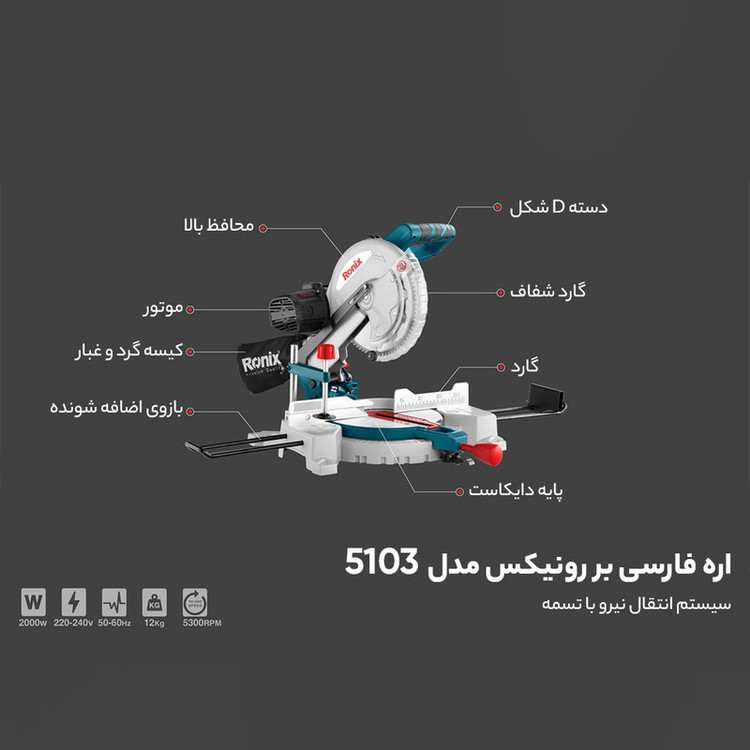 فارسیبر ثابت 5103 رونیکس با موتور تسمهای طراحی شده که موجب افزایش دقت و کاهش انرژی دستگاه میشود. توان تولیدی موتور در فارسیبر موتور تسمهای 5103 رونیکس، 2000 وات است و سرعتی معادل 5300 دور بر دقیقه را ایجاد میکند که صرف چرخاندن صفحه برشی 255 میلیمتری در دستگاه میشود.