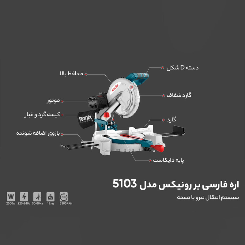 فارسیبر ثابت 5103 رونیکس با موتور تسمهای طراحی شده که موجب افزایش دقت و کاهش انرژی دستگاه میشود. توان تولیدی موتور در فارسیبر موتور تسمهای 5103 رونیکس، 2000 وات است و سرعتی معادل 5300 دور بر دقیقه را ایجاد میکند که صرف چرخاندن صفحه برشی 255 میلیمتری در دستگاه میشود.
